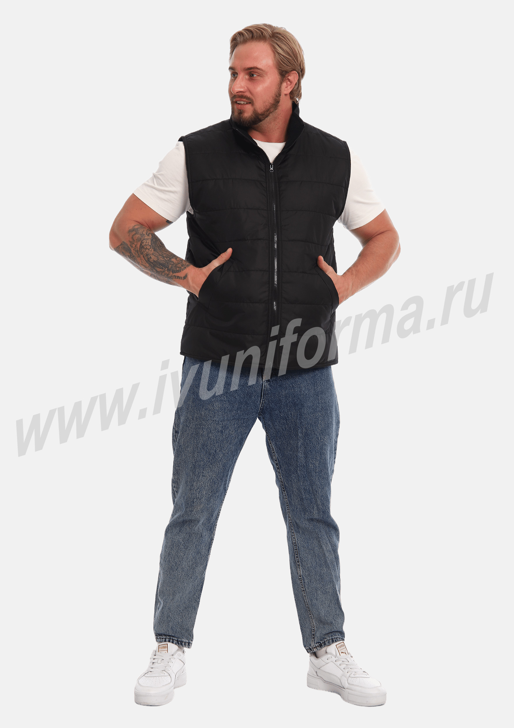 Жилет утепленный на молнии с двумя боковыми карманами в нижней части. Внутренняя часть жилета выполнена из ткани флис. В качестве утеплителя используется синтепон. Жилет является универсальным для использования как мужчинам, так и женщинам.